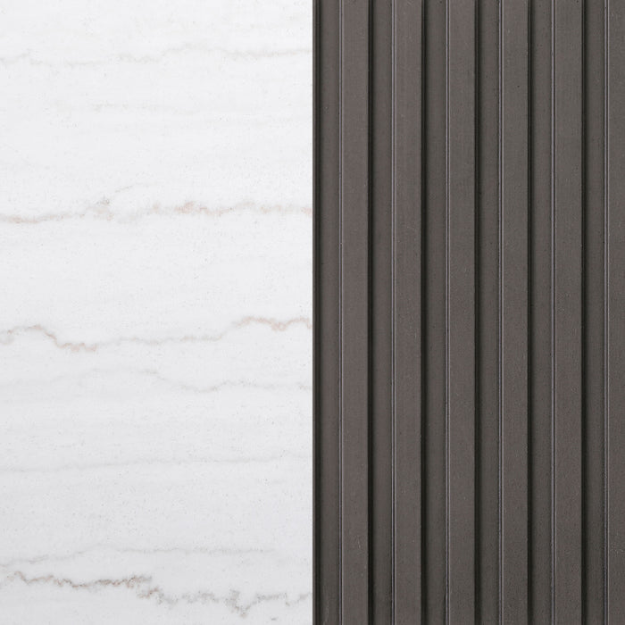 Center your living space with this elegant, modern round coffee table. The genuine white marble top exudes sophistication with its subtle veining, adding organic flair. The clean, light coloration complements any surrounding decor. A ribbed, engineered wood frame in a charcoal finish creates texture and depth, while the brushed gold metal base brings a luxurious touch. This piece seamlessly blends refined materials and design, making it the perfect addition to your living room.